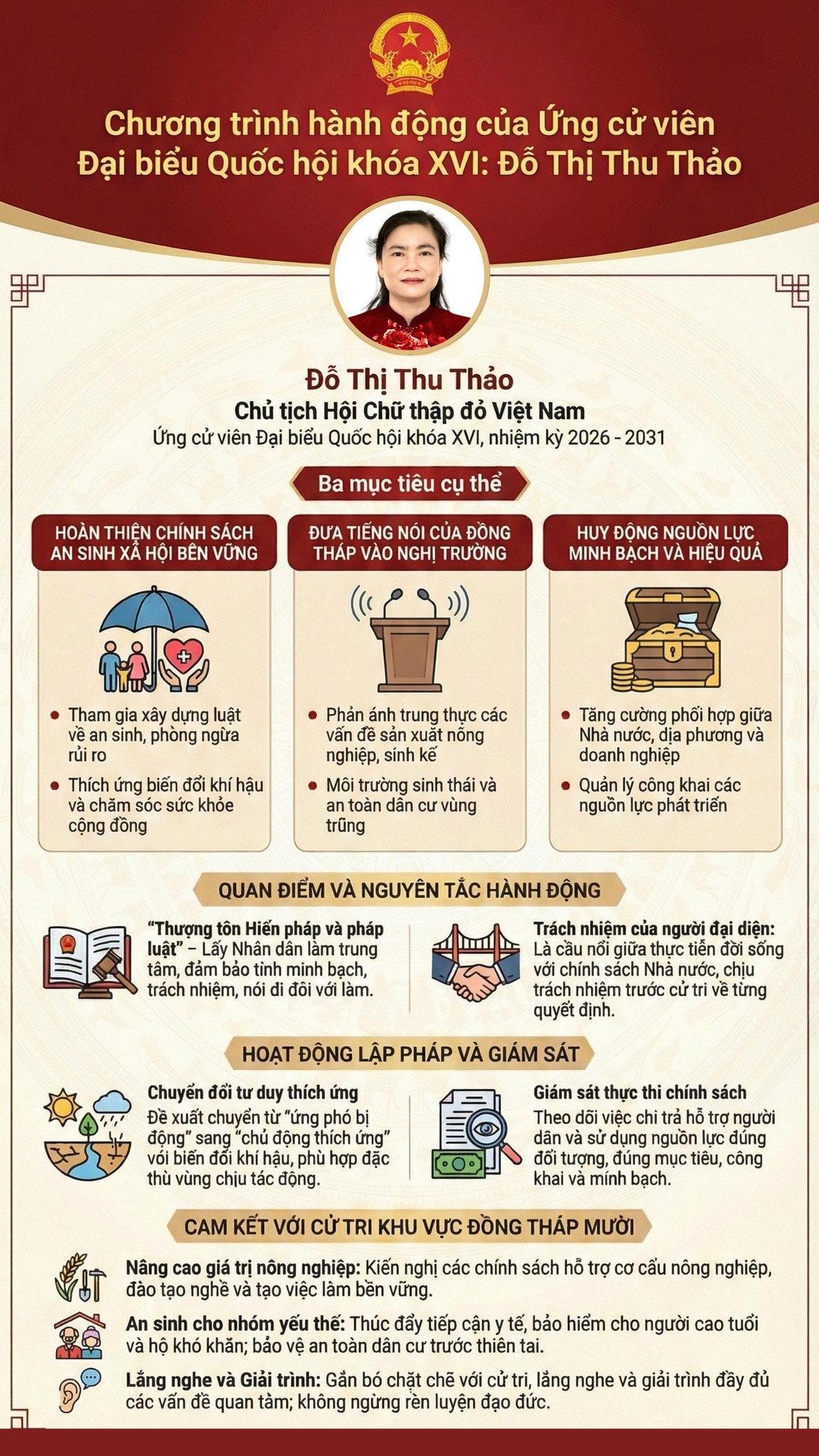 Đối với cử tri và địa bàn vùng Đồng Tháp Mười, địa bàn nơi bà ứng cử, trên cơ sở thấu hiểu những mong đợi của cử tri là sự ổn định sinh kế, cơ hội phát triển cho thế hệ trẻ và sự an tâm trong cuộc sống lâu dài, bà Đỗ Thị Thu Thảo đã đưa ra những chương trình hành động ý nghĩa và thiết thực.