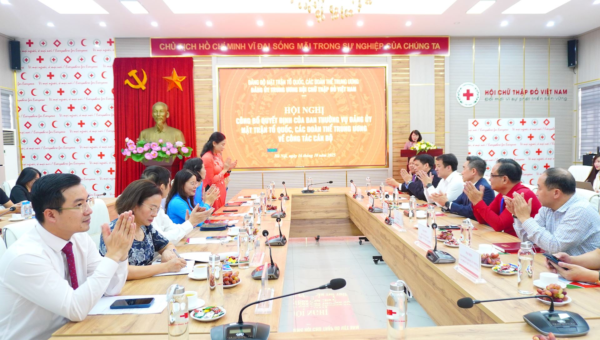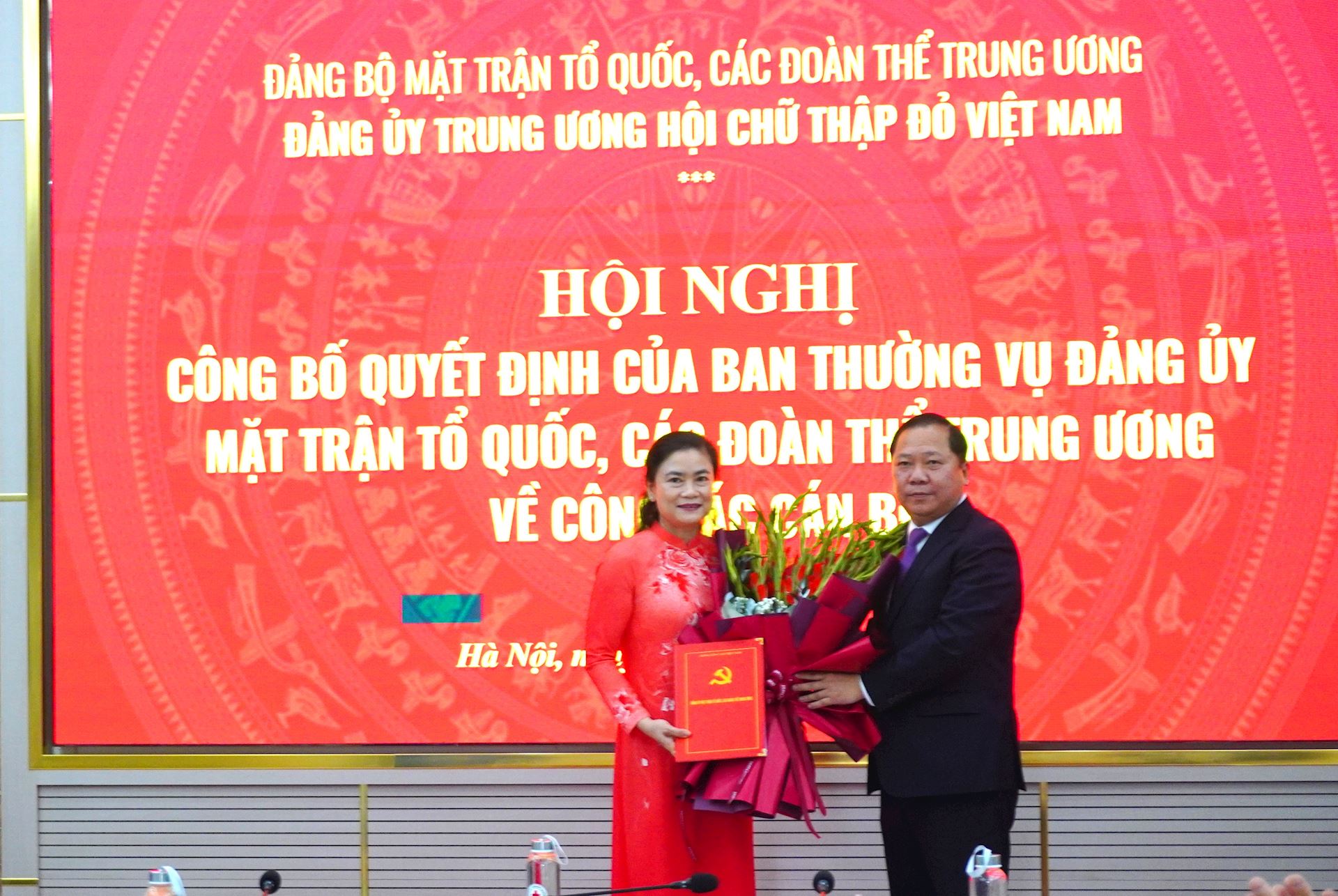 Đồng chí Nguyễn Phi Long, Ủy viên dự khuyết Trung ương Đảng, Phó Bí thư Đảng ủy MTTQ, các đoàn thể Trung ương, trao quyết định về công tác cán bộ cho đồng chí Đỗ Thị Thu Thảo, Bí thư Đảng ủy Trung ương Hội Chữ thập đỏ Việt Nam nhiệm kỳ 2025 – 2030
