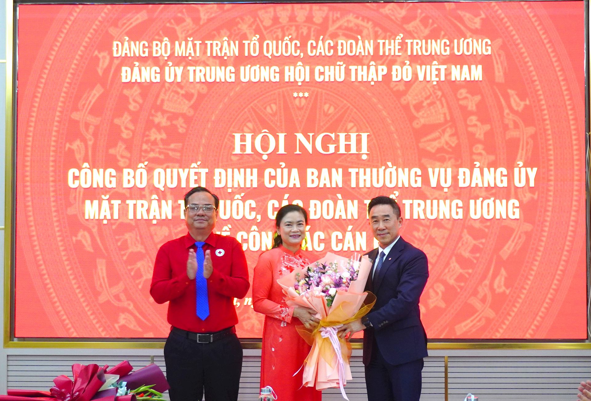 Đồng chí Nguyễn Hải Anh, Phó Chủ tịch, Tổng Thư ký, Điều hành công việc của Hội (bên phải) và đồng chí Vũ Thanh Lưu, Phó Chủ tịch Hội (bên trái) tặng hoa chúc mừng Bí thư Đảng ủy Trung ương Hội Chữ thập đỏ Việt Nam Đỗ Thị Thu Thảo
