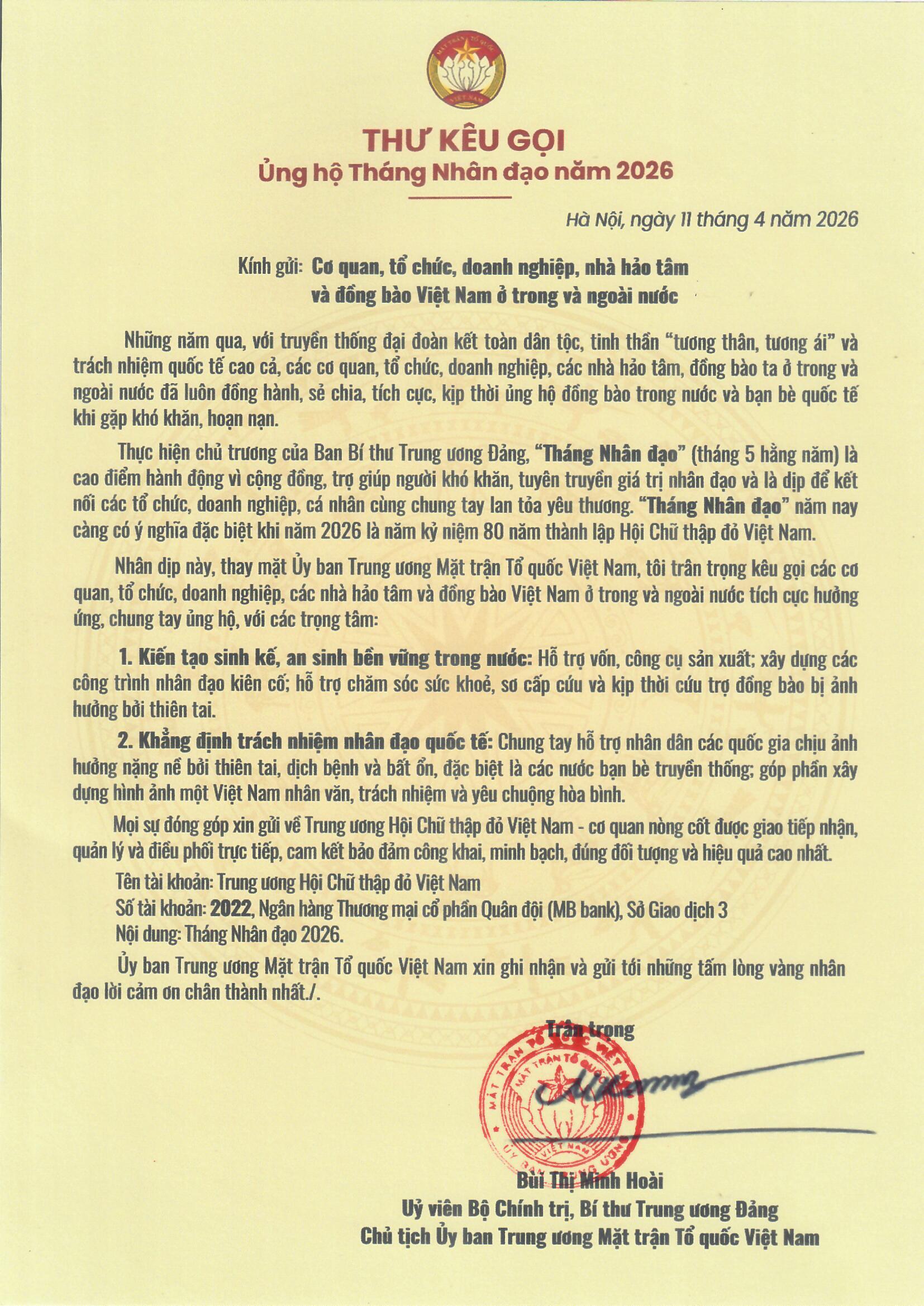 Trong thư kêu gọi, Chủ tịch Ủy ban Trung ương Mặt trận Tổ quốc Việt Nam nhấn mạnh hai nhóm nhiệm vụ trọng tâm, gồm: Kiến tạo sinh kế và bảo đảm an sinh bền vững trong nước, tập trung hỗ trợ vốn, công cụ sản xuất cho người dân; xây dựng các công trình nhân đạo kiên cố; hỗ trợ chăm sóc sức khỏe, sơ cấp cứu và kịp thời cứu trợ đồng bào tại các khu vực bị ảnh hưởng bởi thiên tai; đồng thời khẳng định trách nhiệm nhân đạo quốc tế, thể hiện cam kết của Việt Nam trong việc chung tay hỗ trợ các quốc gia đang chịu hậu quả nặng nề từ thiên tai, dịch bệnh và bất ổn, qua đó góp phần xây dựng hình ảnh một Việt Nam nhân văn, trách nhiệm và yêu chuộng hòa bình.